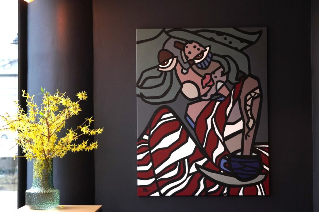 Gal dėl to kavinėje eksponuojami ir ankstyvieji menininkės darbai, ir patys naujausi, kad žiūrovas galėtų pats susidaryti įspūdį apie tai, kaip bėgant laikui keitėsi jos pasaulėžiūra, stilistika, koloritas, pats žanras.