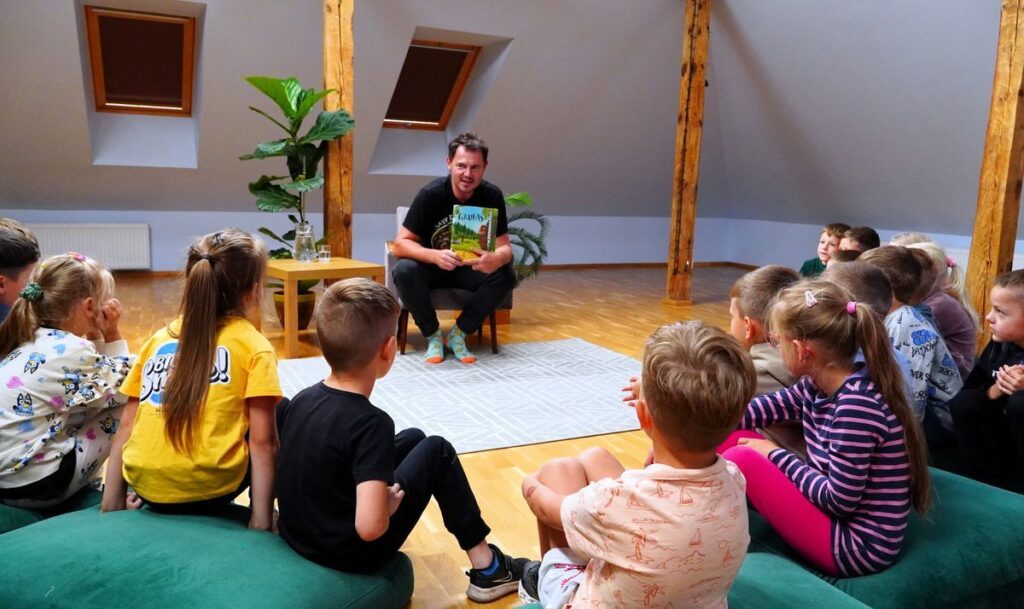 Plungės vaikų ir jaunimo bibliotekoje skambėjo ne tik žodžiai iš knygos, bet ir vaikų balsai bei juokas – R. Jonaitis netrukus visus įtraukė į nuotaikingą pokalbį apie knygos veikėjus ir apskritai apie gyvenimą, kuris atsivertus smagią knygelę nušvinta naujom spalvom.
