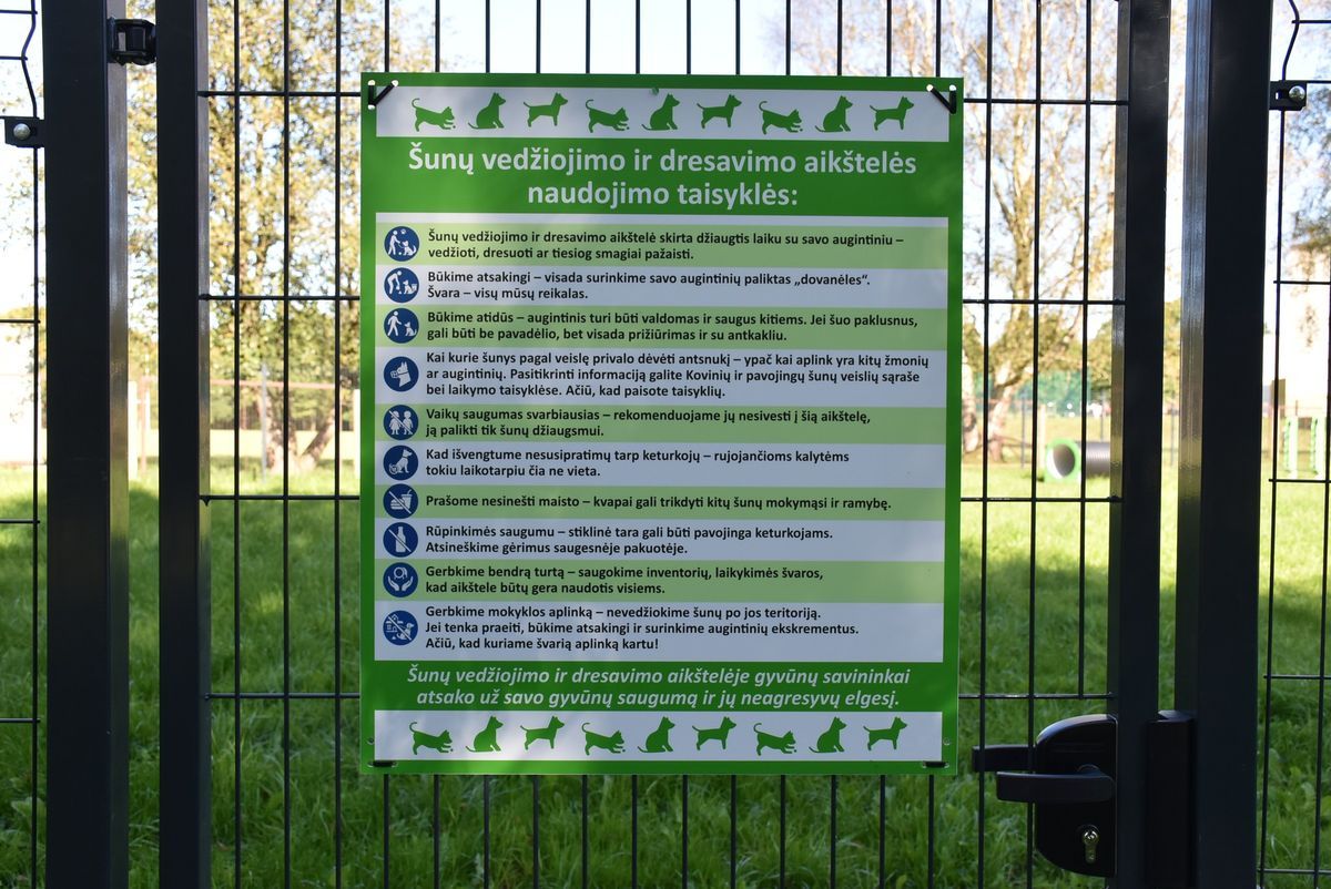 Informuojame, kad naudojantis šia aikštele bus privaloma laikytis tam tikrų taisyklių: šunų vedžiojimo ir dresavimo aikštelė skirta džiaugtis laiku su savo augintiniu – vedžioti, dresuoti ar tiesiog smagiai pažaisti. Būkime atsakingi – visada surinkime savo augintinių paliktas „dovanėles“. Švara – visų mūsų reikalas.
